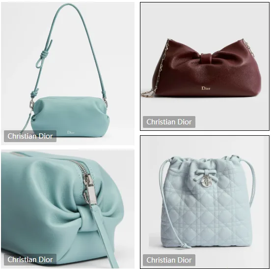Christian Dior seamlessly blends French romance with modern design, creating a full-category collection centered around the bow motif. In handbags, the brand uses supple leather as a foundation, introducing pieces such as burgundy clutch bags with sculptural bows, light blue quilted drawstring bucket bags, and cloud-shaped shoulder bags.